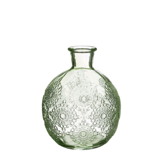 Ozdobna, jasnozielona, szklana butelka w formie wazonu z serii Bologna Soft Green marki IDEAS 4 Seasons. Butelka o wysokości 12,5 cm i pojemności 400 ml, to idealny dodatek do Twojego wnętrza. Butelka w kształcie kuli, posiada ozdobne tłoczenia.