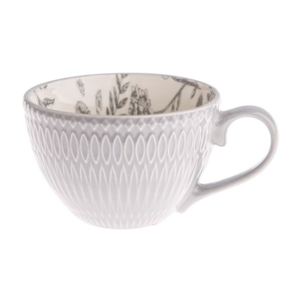 Niski kubek o pojemności 380 ml (pojemność liczona po rant kubka) wykonany z ceramiki. Kubek po zewnętrznej stronie posiada tłoczony, kropkowany wzór w kolorze szarym przecieranym, natomiast wnętrze kubka zdobione jest szarym wzorem na beżowym tle. Całość tworzy ciekawą i nietuzinkową kompozycję. Piękny, ergonomiczny kubeczek pozwoli Ci delektować się Twoim ulubionym napojem.