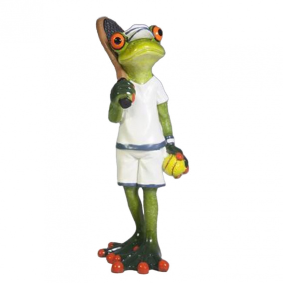 Oto prawdziwa mistrzyni kortu w świecie płazów! Figurka żaba tenisistka trzymająca w jednej łapce rakietę tenisową, a w drugiej żółtą piłeczkę. Żabka ubrana w sportowy strój. Na głowie ma czapeczkę z daszkiem, na łapce ma umieszczoną frotkę do wycierania potu z czoła. Materiał tworzywo sztuczne, wysokość figurki 17 cm.