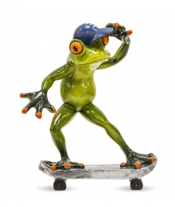Żaba Skateboardzistka – mistrzyni deskorolki i dobrego stylu! Figurka żaby na deskorolce z niebieską czapeczkę z daszkiem. Żabka dumnie stoi na srebrnej deskorolce, jedną łapką trzyma daszek czapeczki. Materiał tworzywo sztuczne, wysokość figurki 14,5 cm.