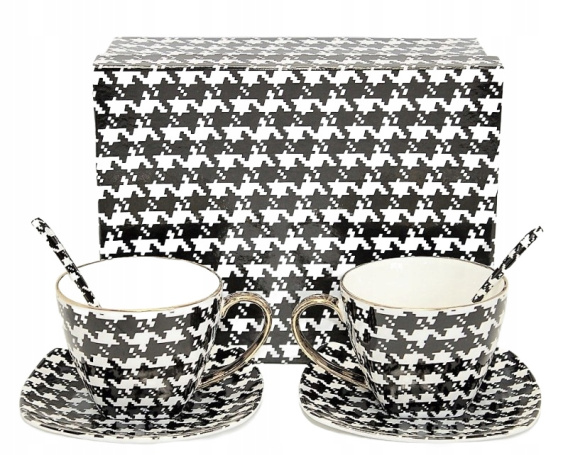 Wyjątkowy zestaw dwóch filiżanek ze spodkami oraz łyżeczkami, z serii Pepitka. Zestaw z kolekcji Queen Isabell. Pojemność filiżanki 250 ml (pojemność liczona po rant filiżanki). Komplet wykonany został z wysokiej jakości białej porcelany Fine Bone China, zdobionej motywem czarno-białej pepitki.