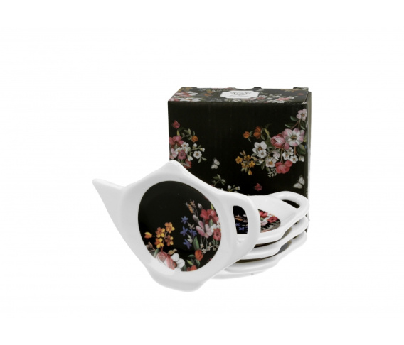 Komplet 4 podkładek - skapek na torebki z herbatą lub zaparzacz z serii Vintage Flowers Black, wchodzące w skład linii Duo Classics, wykonanych z porcelany New Bone China. Kolekcja wykonana z białej porcelany wewnątrz, zdobiona wyrazistym wzorem kwiatowych bukietów na czarnym tle.