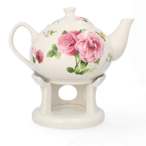 Gustowny porcelanowy, biały dzbanek z podgrzewaczem o pojemności 1 litra zdobiony różami. Komplet idealnie nadaję się na prezent na różne okazje.