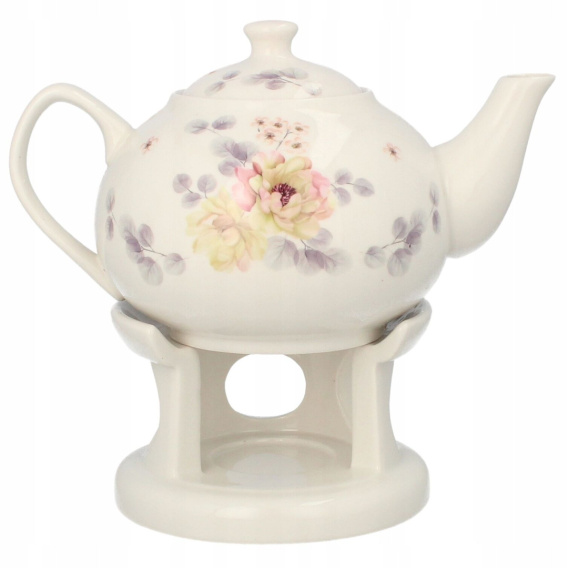 Gustowny porcelanowy, biały dzbanek z podgrzewaczem o pojemności 1 litra zdobiony kolorowymi kwiatami. Komplet idealnie nadaję się na prezent na różne okazje.