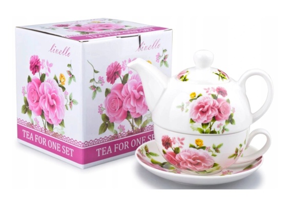 Bardzo oryginalny komplet z porcelany składający się z dzbanka oraz filiżanki z talerzykiem ozdobiony motywem kwiatowym. Całość zapakowana w prezentowe pudełko - idealne na prezent. W trakcie parzenia herbaty dzbanek można pozostawić na filiżance aby ją ogrzać, w ten sposób herbata na dłużej pozostaje ciepła.