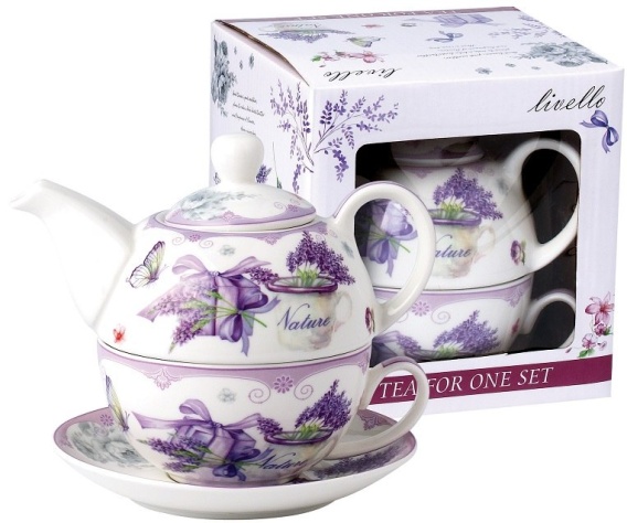 Bardzo oryginalny komplet z porcelany składający się z dzbanka oraz filiżanki z talerzykiem ozdobiony motywem lawendy. Całość zapakowana w prezentowe pudełko - idealne na prezent. W trakcie parzenia herbaty dzbanek można pozostawić na filiżance aby ją ogrzać, w ten sposób herbata na dłużej pozostaje ciepła.