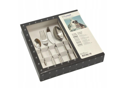 Zestaw sztućców 24 elementowy z serii Callisto marki Lusol Sola Switzerland AG. Komplet został wykonany z wysokiej jakości stali nierdzewnej 18/10. W skład zestawu wchodzi: 6 łyżek stołowych, 6 widelców stołowych, 6 noży stołowych, 6 łyżeczek do herbaty.